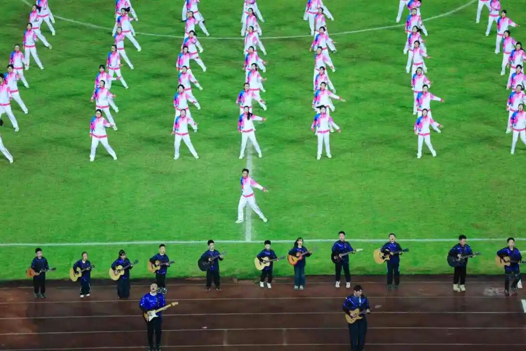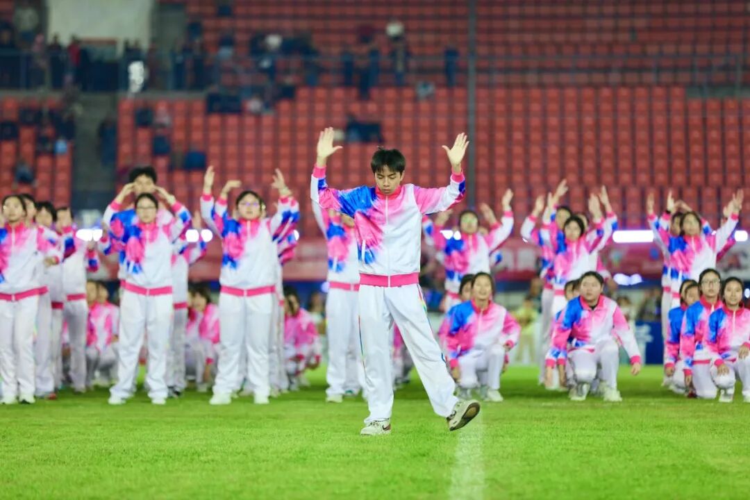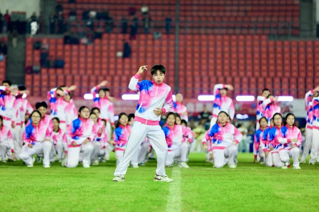 表演于开幕式核心环节隆重呈现。150名嘉祥学子与庞大的电声乐团默契配合,动作整齐划一,队形变换精准默契,展现出极强的节奏感与表现力。《不再犹豫》激昂的旋律与“为球员加油”的积极主题交织,将现场氛围推向高潮。这场表演不仅是力与美的展示,更是自贡嘉祥外国语学校“幸福教育,责任担当”理念的生动实践,学子们以自信昂扬的姿态,展现了“为祖国培养具有国际竞争力的幸福公民”的育人成果。