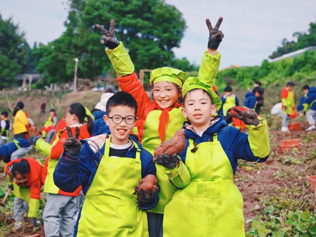 ▸ @小学语文王凤佳 研学地里, 孩子们举着沾满泥土的大红薯,